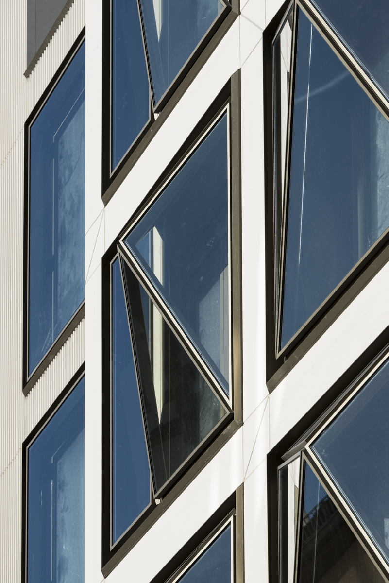 The prismatic bay windows on the upper floors also contribute to the visual distinctiveness.