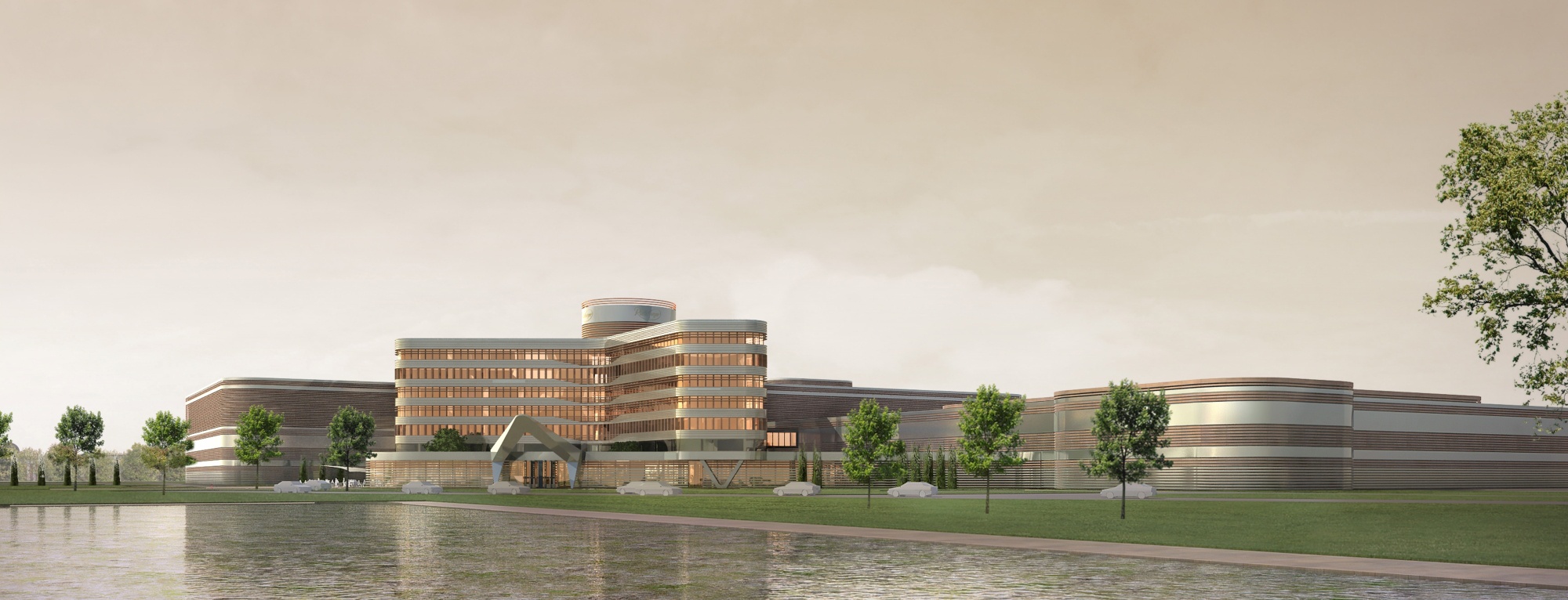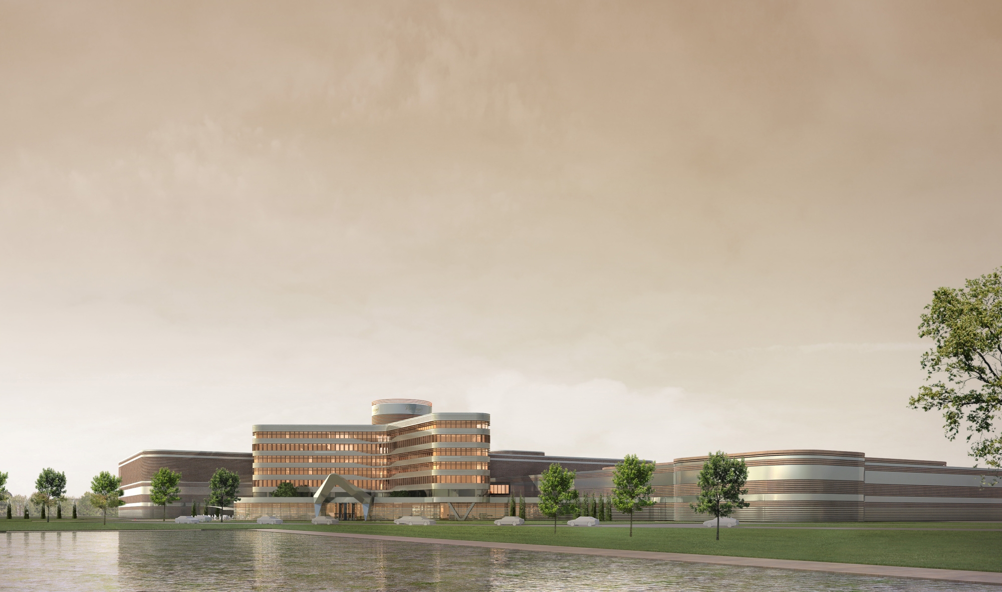 The access layout is adapted to the specified usage scheme. The main entrance is located on the east side, with prominent access from the parking areas and the central green space. The executive board has VIP parking spaces and can reach their respective floors directly via the main entrance or the access to the conference rooms.