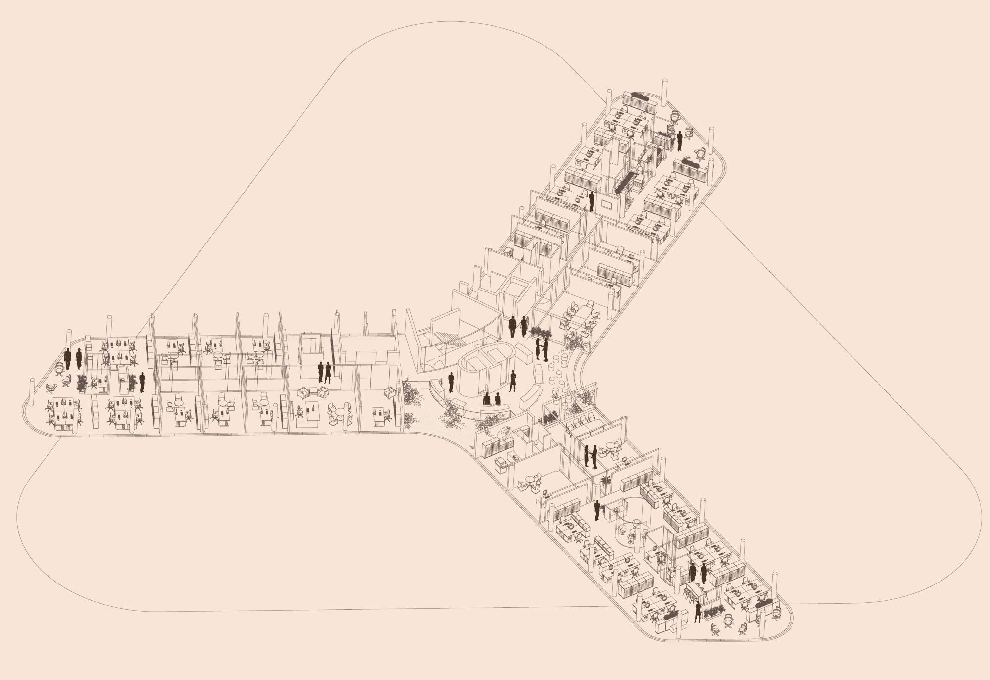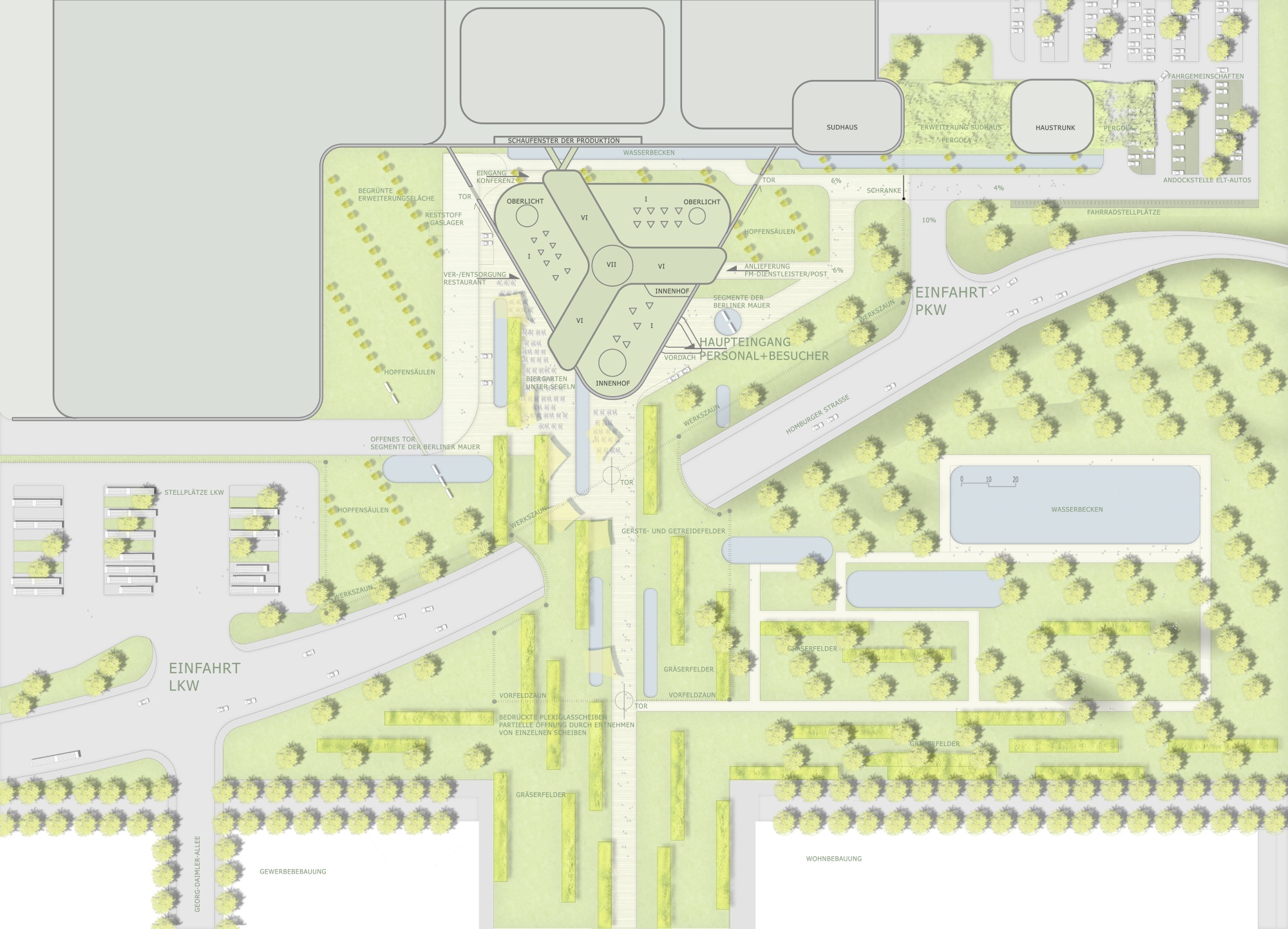 The spatial arrangement of the buildings also had to ensure optimal access, delivery routes, and parking for the various functions of the complex, encompassing production, administration, and supply. And last but not least, all employees were to be able to enjoy modern workplaces, both inside and out.