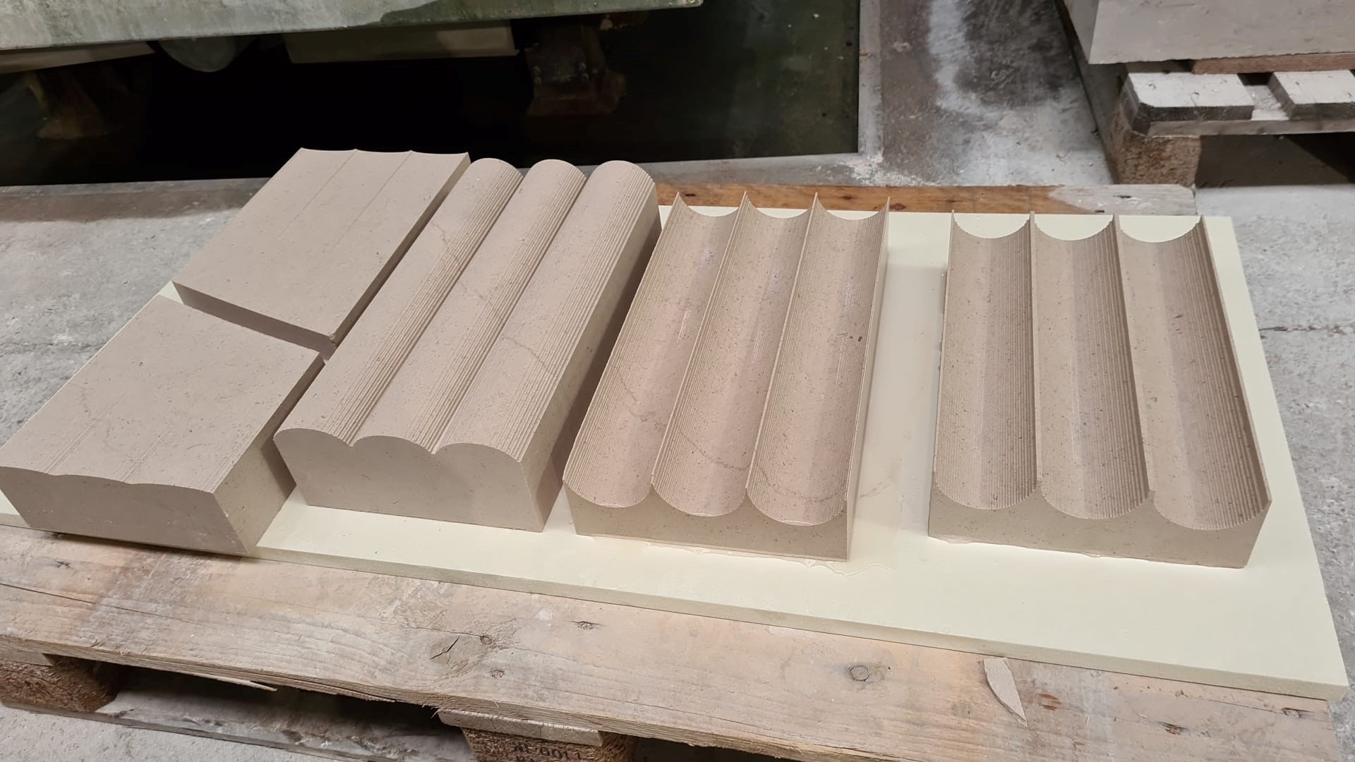Vielmehr kann man eben deshalb von einer großen Wandplastik sprechen, weil das Objekt über die gesamte Höhe und Breite durch eine punktgenaue Vorzeichnung der einzelnen Kannelüren und deren ebenso punktgenaues Ausfräsen aus Naturstein entstanden ist.