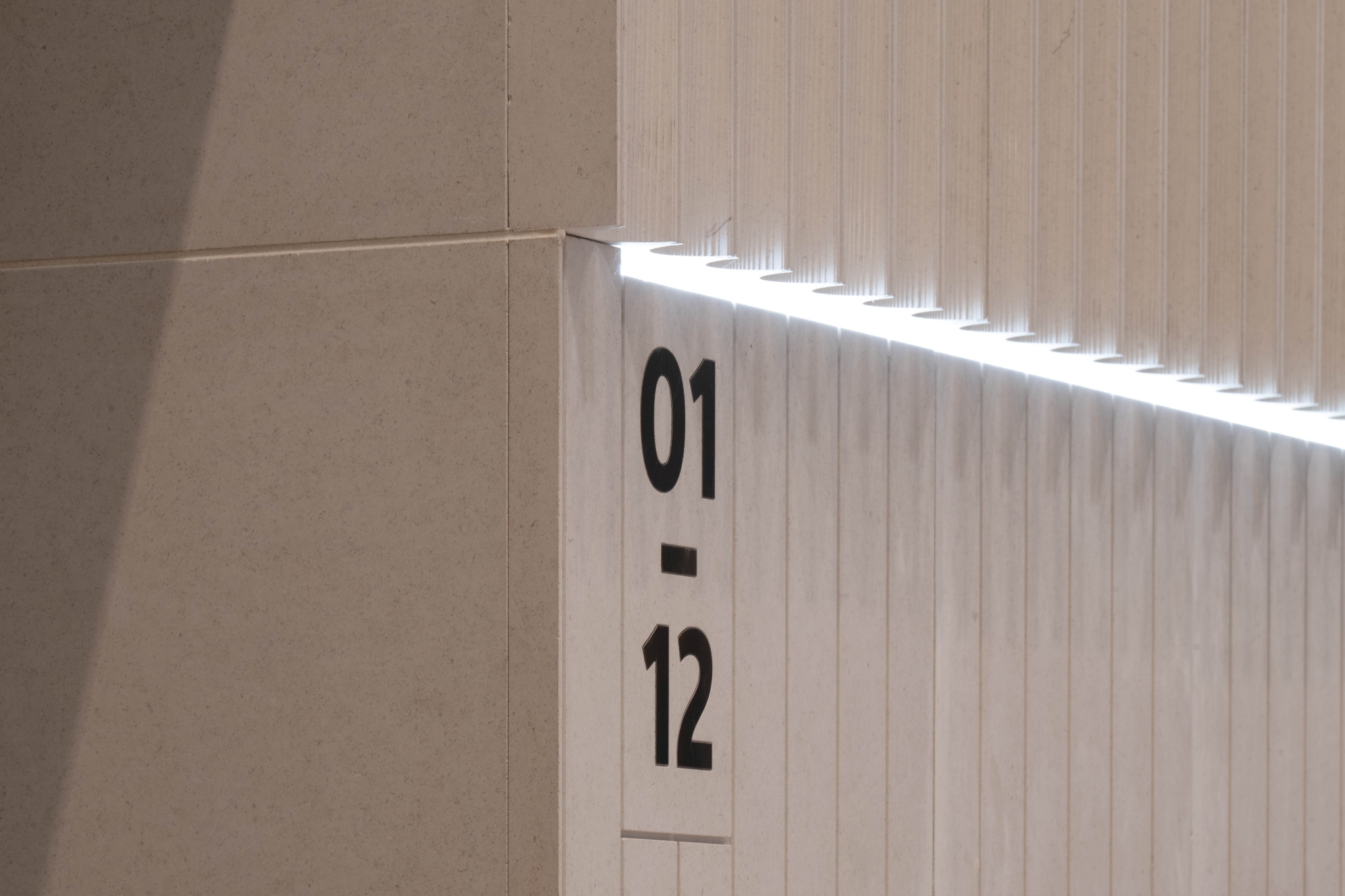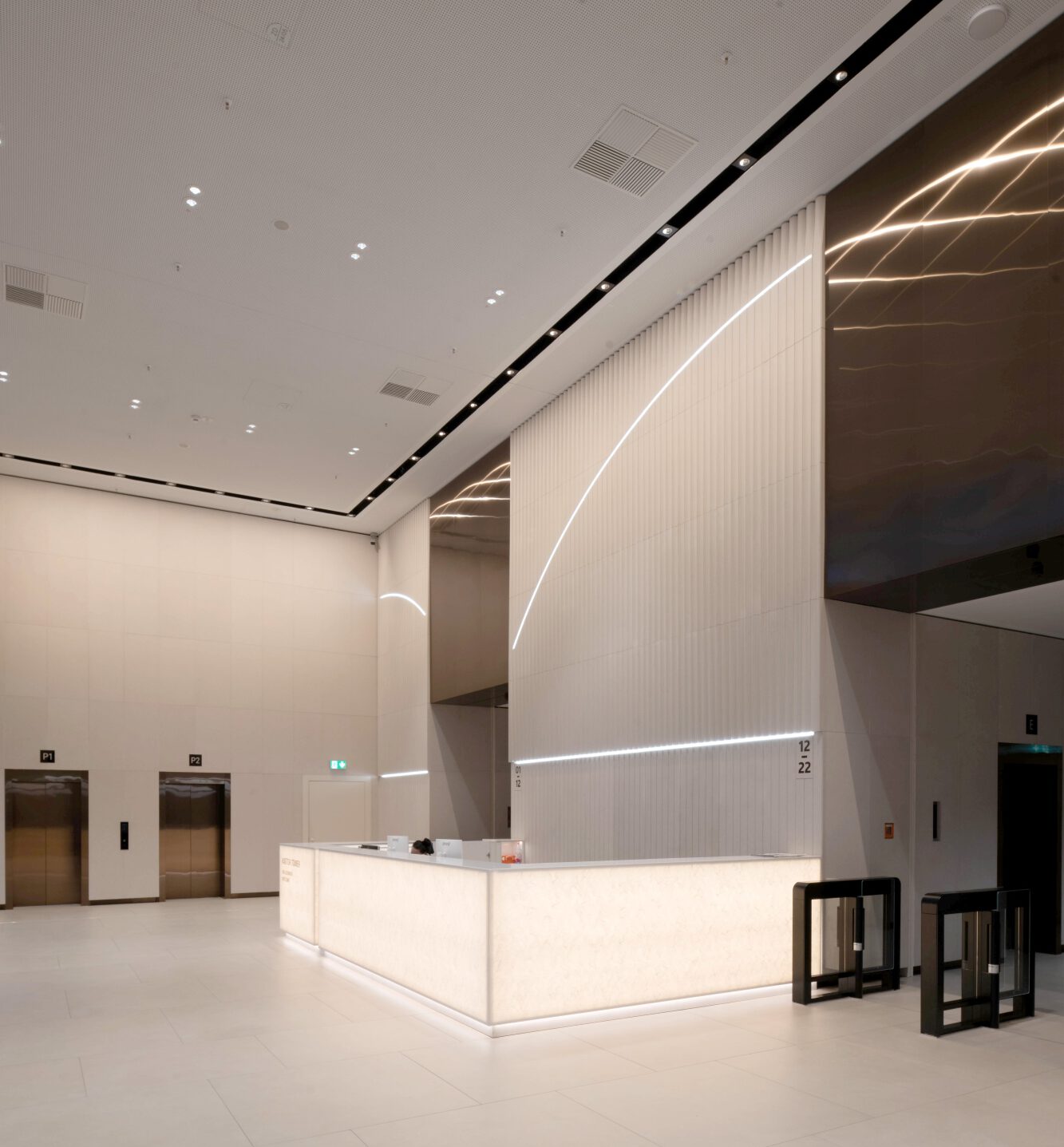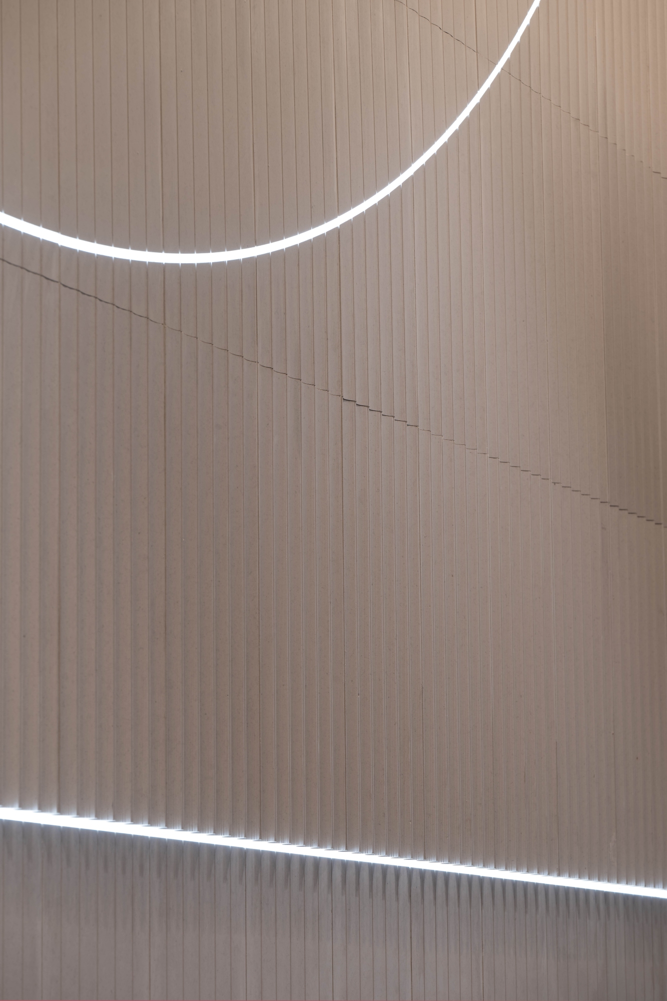 In die strikt senkrechte Orientierung der Elemente sind weit schwingende Lichtbögen „eingraviert“. Die LED-Lichtbänder erhellen den Raum zusätzlich und verlaufen ebenfalls auf der einen Seite konkav, auf der anderen Seite zeichnen sie die konvexe Säulengestalt nach.
